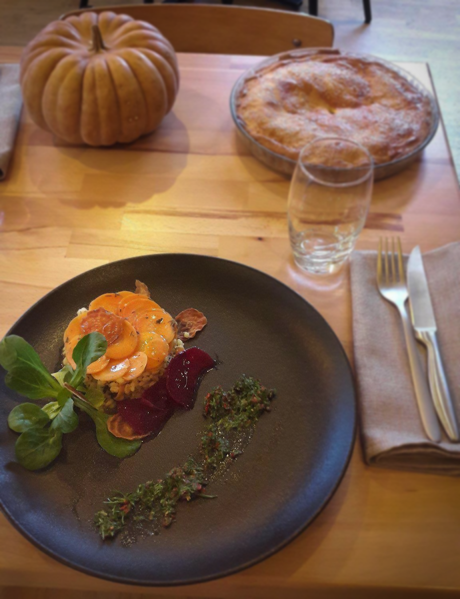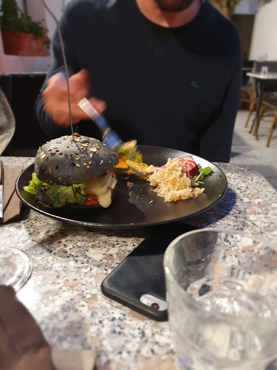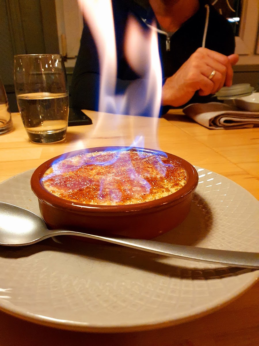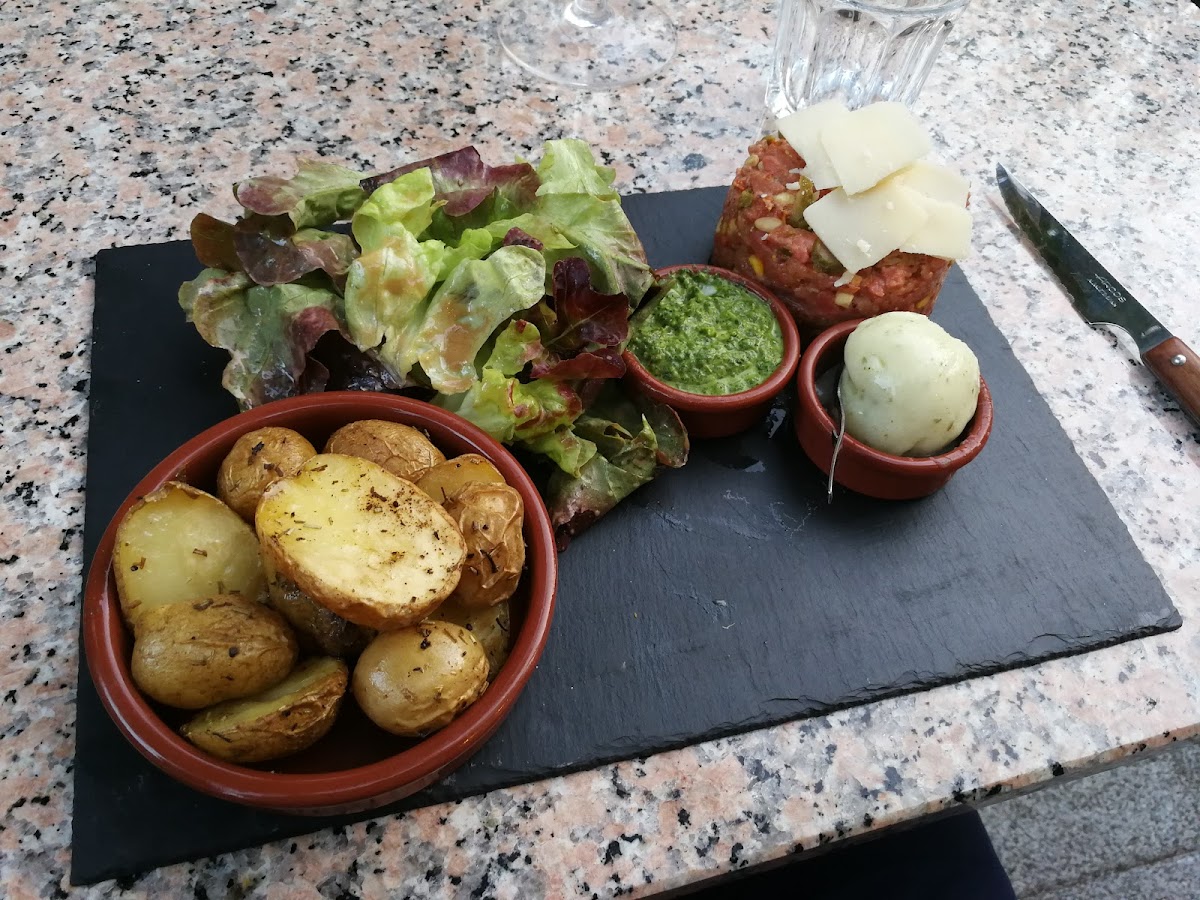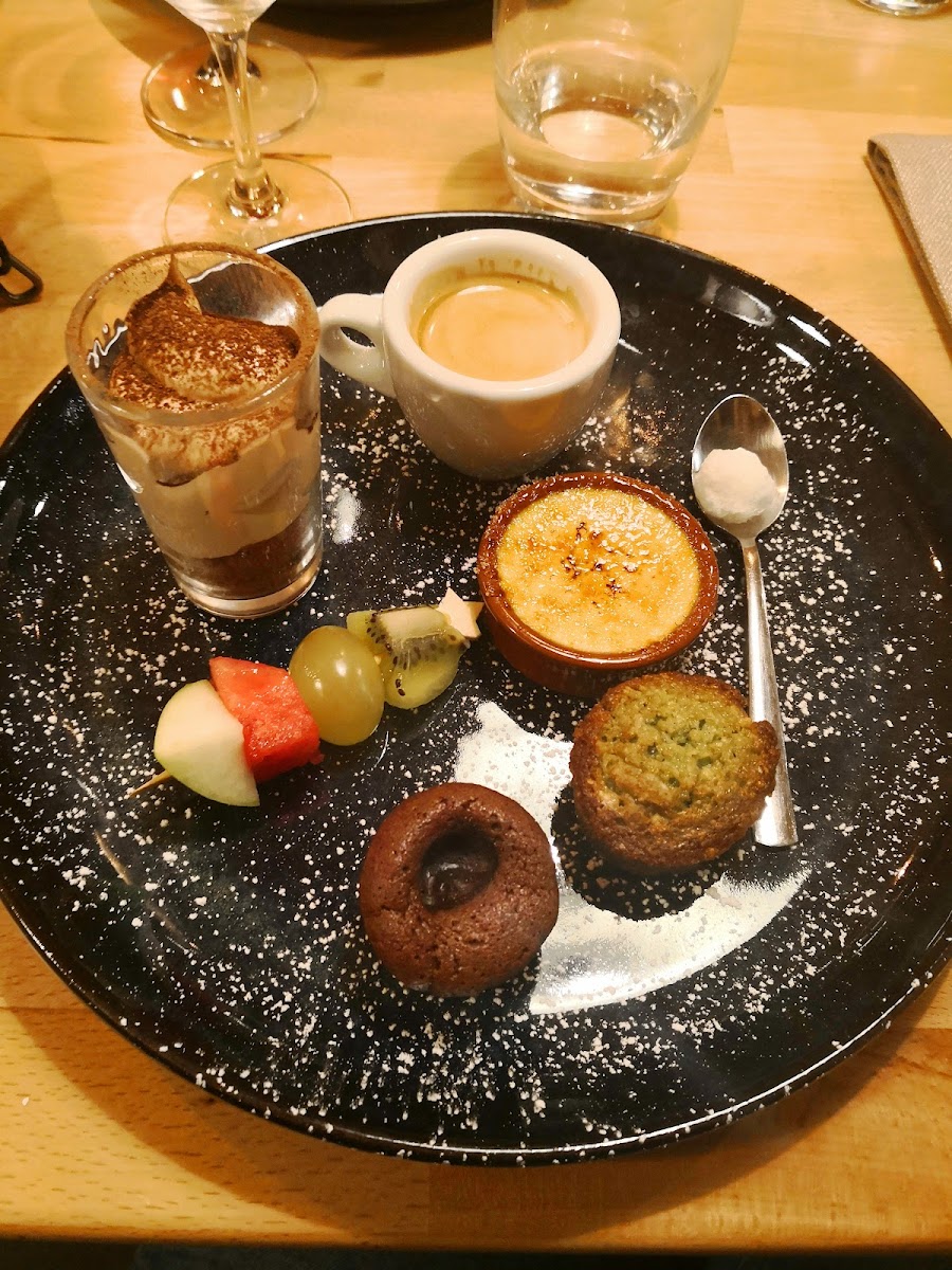 We had the plat du jour, started with a trio of tomatoes in a herb pesto, followed by beef bourguignon and mashed potatoes and finished with orange and lemon meringue pie. For less than 20€. All absolutely delicious. Best mash ever.